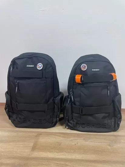 Nosíme obě stejný batoh, na kterém je placka s naším logem.